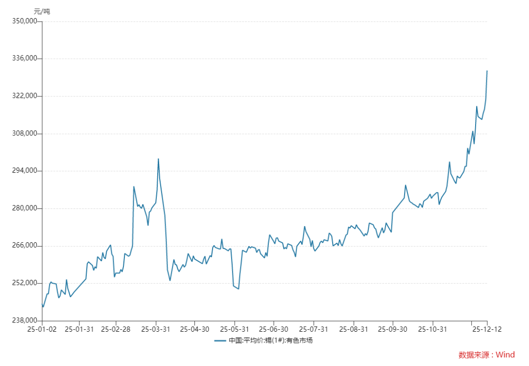 12月12日,國內(nèi)現(xiàn)貨錫價在突破每噸33萬元整數(shù)關(guān)口后繼續(xù)上行,Wind數(shù)據(jù)顯示,錫(1#)當(dāng)日報價達(dá)331,640元/噸,單日上漲10,870元,年內(nèi)累計漲幅約37%,價格攀升至2022年6月以來的最高位。同期,滬錫期貨主力合約亦大幅收高,市場看漲情緒顯著。